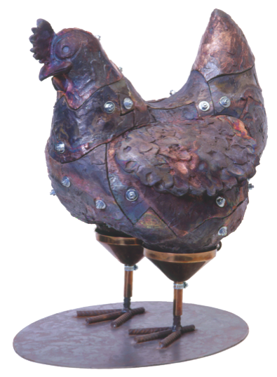 2017 - dalla parte delle galline - terracotta, ferro, imbuti, spago, dadi e bulloni, h cm 170